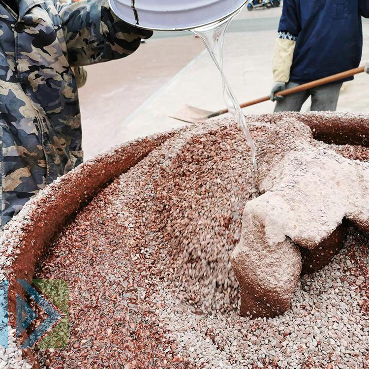 2、透水胶粘石的专用胶水应选择户外耐候性好、粘结性强,不易黄变的粘接材料,推荐改性环氧树脂专用胶。胶粘石专用胶分为树酯A胶和树酯B胶(固化剂),按专业配比配制而成的改性环氧树酯专用胶。