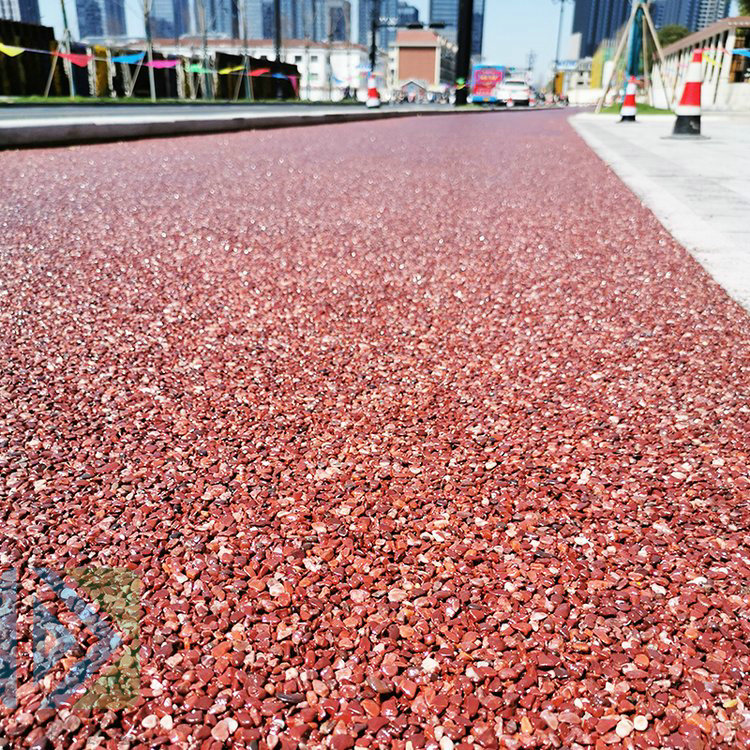 3、透水胶粘石用做承载性路面,一般在水泥路面或者透水混凝土路面等硬化路面上设计为2--4公分厚为宜,不建议直接做在素土的基础上,不然基层夯土因为水流引起疏松,容易导致路面出现掉石情况。如若用作树池,因面积小可以做在素土基础上。