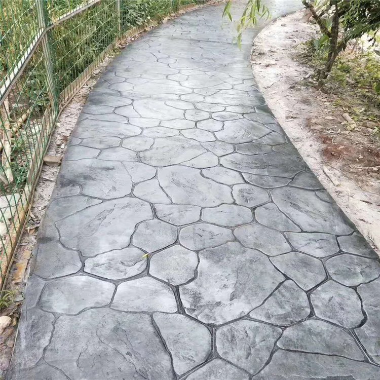 5、使用艺术地坪模具对地坪面层进行纹理处理。艺术地坪模具应配套使用,首先确定好纹理的分布方向,选好第一块模具放置的位置和角度,然后其它的模具依次紧贴第一块模具放置。彩色混凝土艺术地坪压模采用人工压模,压模应由技术较好的人员进行作业以保证压纹深度一致和模具放置的准确性。
