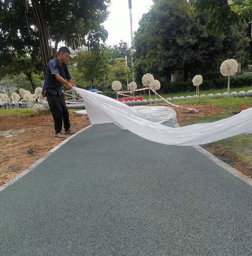 硬化与养护:由于透水混凝土具有开孔结构,表面比较粗糙,水泥浆蒸发速度较快,因此硬化比常规混凝土更为关键。 由于水用于与泥浆发生化学反应,因此它在透水混凝土的快速固化中起着关键作用。 在一些项目中,在压实之前,通常使用蒸发抑制剂来最大限度地减少表面水分流失。 由于透水混凝土路面不会出现泌水,更容易出现塑性收缩和开裂。 其实在透水混凝土浇筑之前,透水混凝土就已经开始硬化了。 此时,地基必须保持湿润,防止混凝土吸水。 浇注后,建议在硬化过程中用塑料薄膜覆盖至少7天。 同时,不建议用砂子加固塑料膜,因为在清除过程中可能会不小心溢出并堵塞透水混凝土的孔隙。 可采用木板、钢筋、木桩或其他方法固定塑料薄膜,防止其从路面上脱落。 浇注、压实、制作接缝线后,应尽快开始硬化处理。 完成所有这些步骤后,通常会在 20 分钟内完成。 同时,高温和大风天气对混凝土的硬化有明显的影响,因此在施工时也应考虑这些因素。