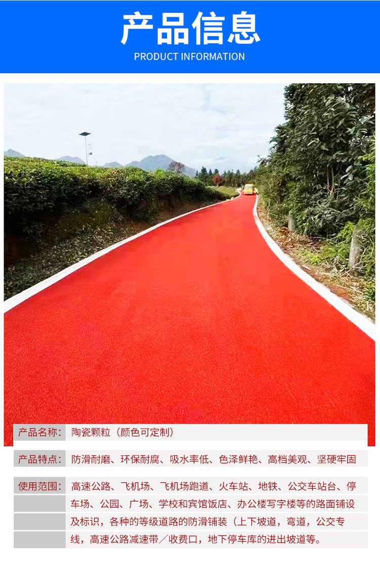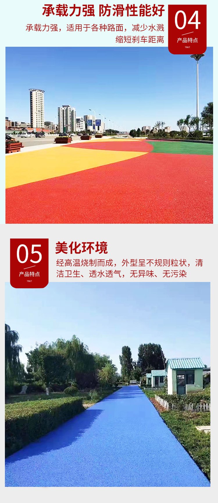 彩色防滑陶瓷颗粒路面采用的颗粒是经由1250℃高温烧制而成陶瓷粒,具有高硬度、不褪色、粒径均匀、耐污染环保型材质等特点,而聚氨酯粘合剂具有抄强粘接力和适宜的柔韧性。二者结合制作防滑路面就能很好的起到不掉砂、不产生收缩裂缝、耐污性好。