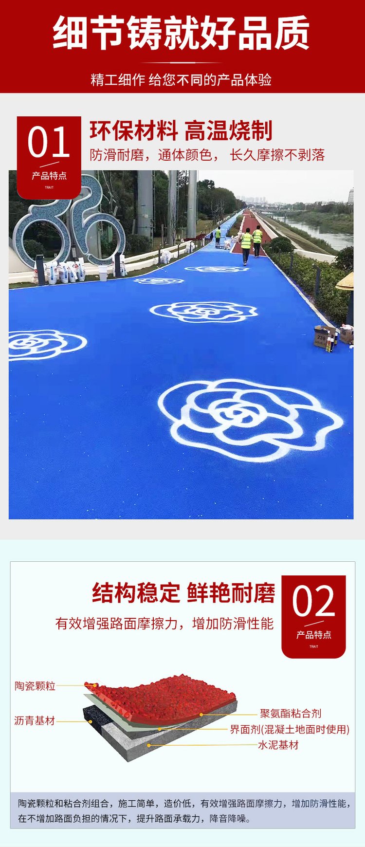 目前传统的沥青路面在刚铺设完成后短期内的防滑性能也非常好,但是经过一段时间的摩擦损耗后,路面表面结构深度就会变小,这样就大大的降低了防滑性能,而陶瓷颗粒防滑路面的特性就是不掉砂,使用一段时间之后也不会降低路面的防滑性能,所以对提升路面行车安全有很大的效果。