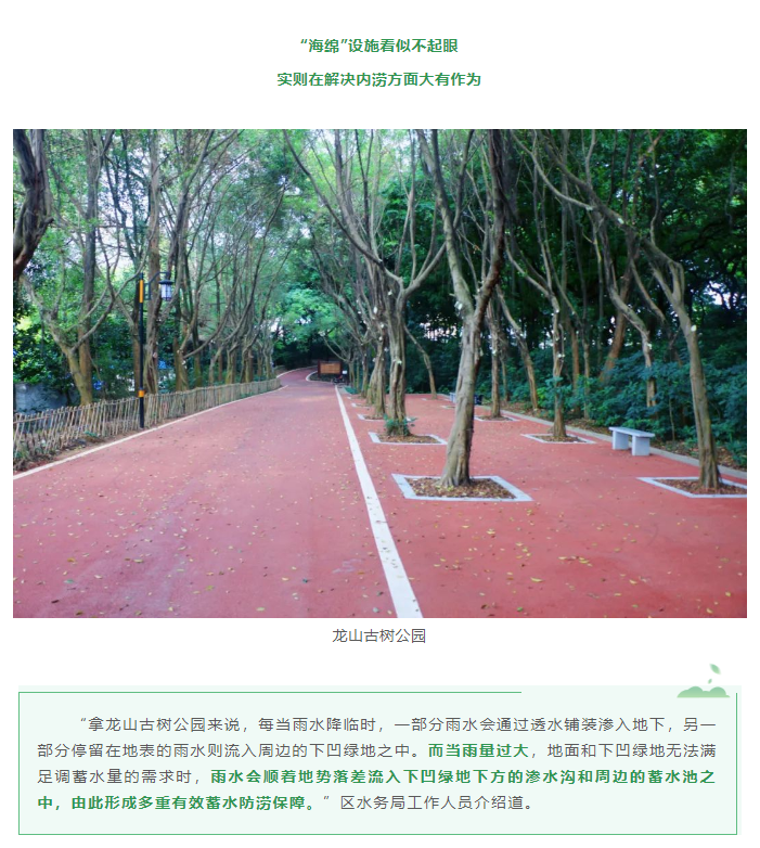 广东大来生态集团积极响应政府号召,力求为政府献计献策,从根本出发建设海绵城市,特针永宁街实施龙山古树公园升级改造工程,组织专家实地考察规划,同步启动了海绵城市典型示范项目建设,以下凹绿地、透水混凝土铺装等“小海绵”与蓄水池、渗水沟等“中海绵”设施的精巧设置,着力解决该片区逢雨必涝的难题,提升城市韧性。