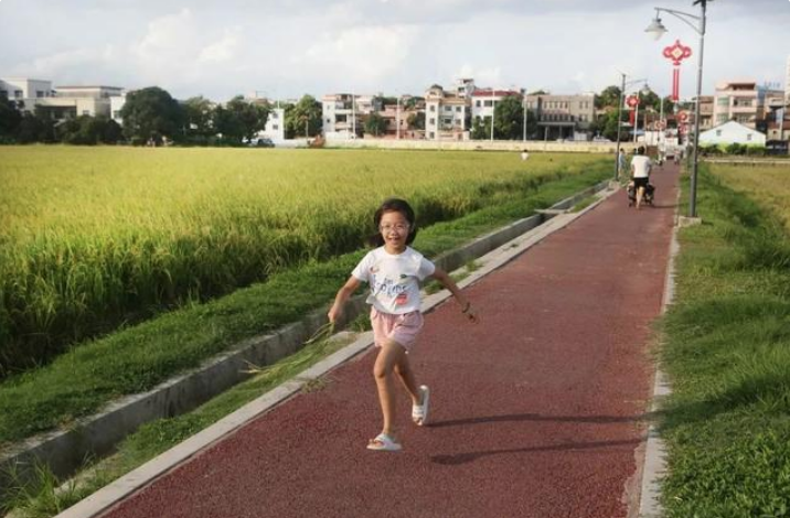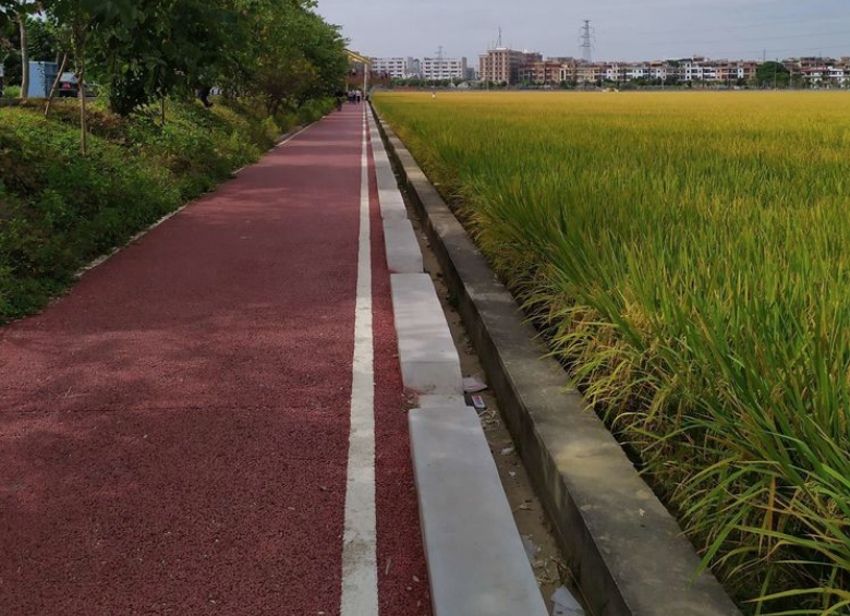 稻田四周的步道均采用新型透气环保透水混凝土铺装方式摊铺,防滑、透水,干净舒适的环境一改农村湿滑田埂路影像,特别适合亲子游玩。